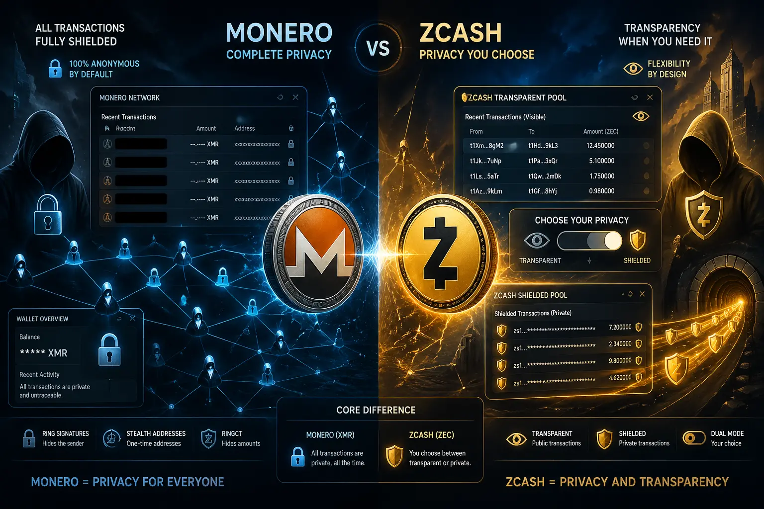 | Feature | Monero (XMR) | Zcash (ZEC) |