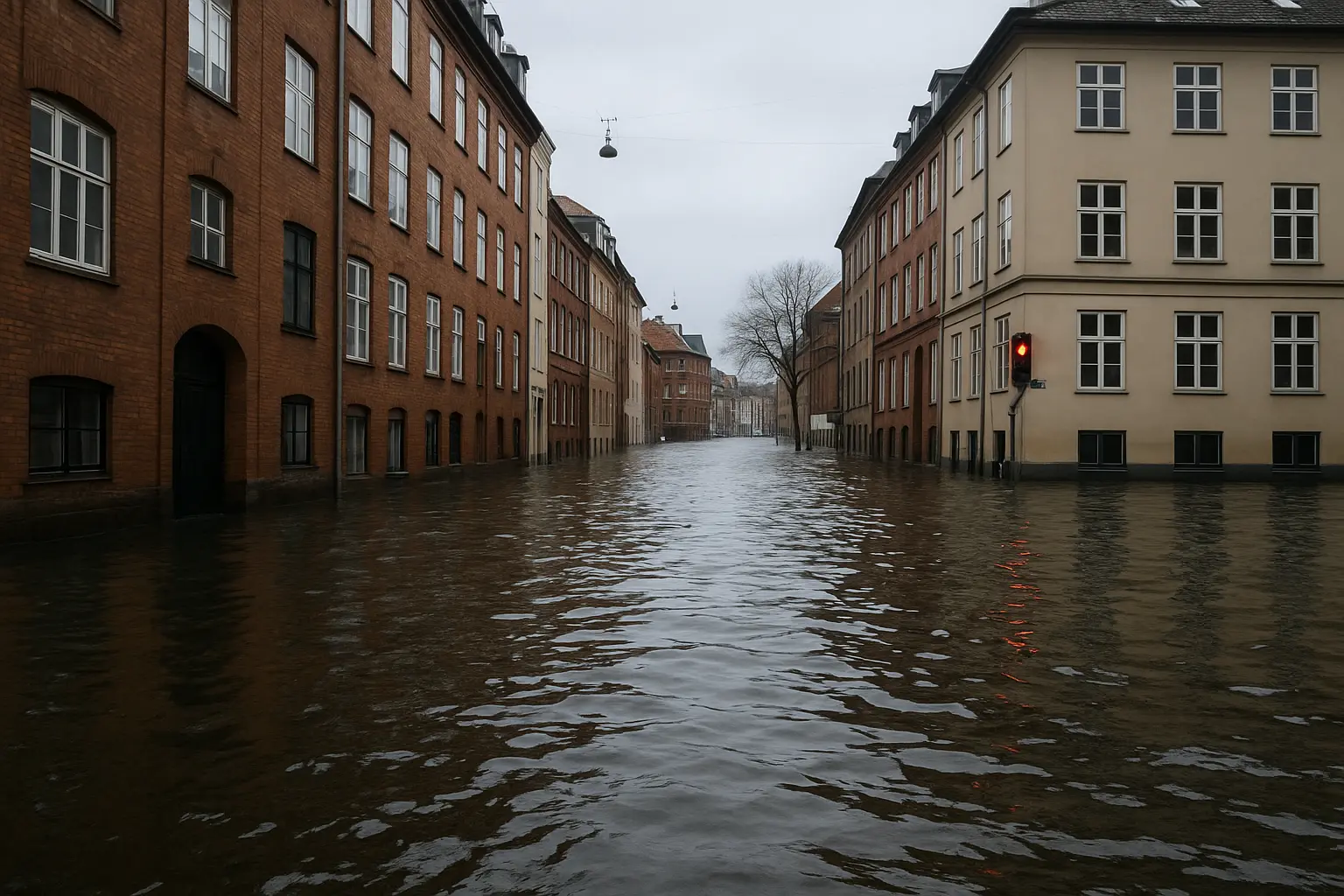 Flooded Copenhagen street during storm, highlighting climate impact